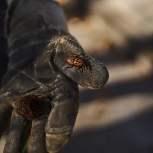 Um jardineiro enluvado segura um gorgulho-vermelho-das-palmeiras e seu casulo encontrados durante a poda de uma árvore em um jardim particular