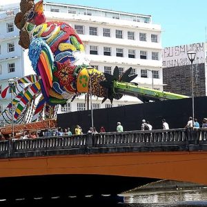 Um dos símbolos do carnaval pernambucano, a escultura do Galo da Madrugada, que todos os anos é erguida no Centro Histórico de