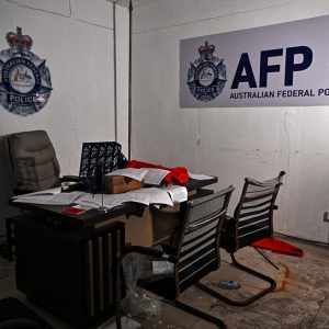 Monitores de computador quebrados em escritórios bombardeados, uniformes falsos de polícia espalhados, notas falsas de cem dólares e até uma