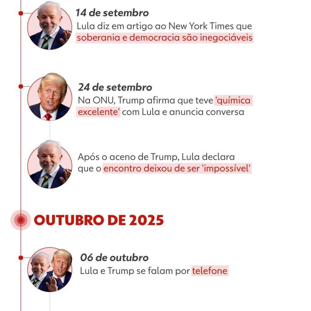 A possibilidade de um encontro entre Lula e Trump foi anunciada no mês passado pelo líder americano durante a Assembleia Geral da Organização das Nações Unidas (ONU), em Nova York. A conversa ocorre em meio ao tarifaço, com sobretaxa de 50% a produtos brasileiros.