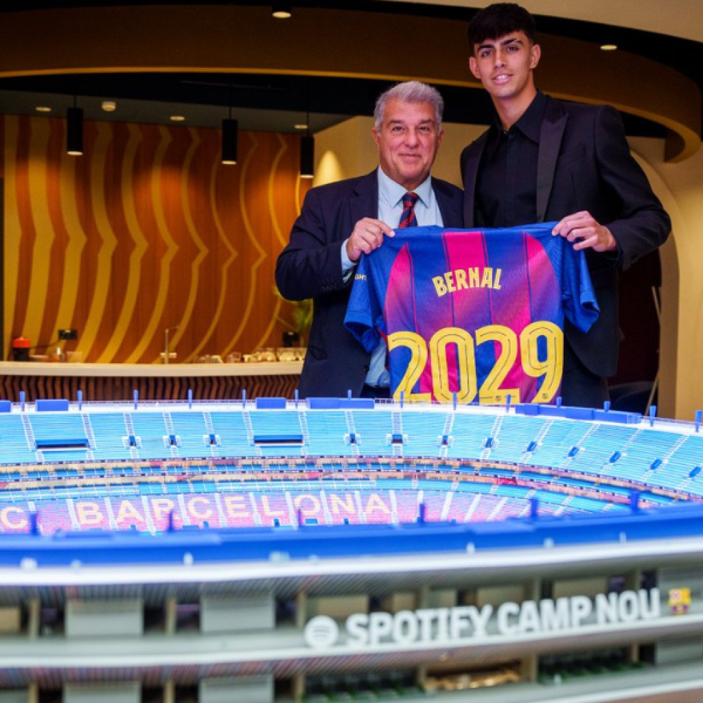 O Barcelona anunciou nesta segunda-feira (29) a renovação do contrato do meio-campista Marc Bernal até junho de 2029. A assinatura ocorreu na sede do clube, com a presença do presidente Joan Laporta, do vice Rafael Yuste e do diretor de futebol Deco. O ponto mais impactante do acordo foi a definição da multa rescisória: 500 milhões de euros, o equivalente a R$ 3,1 bilhões.
