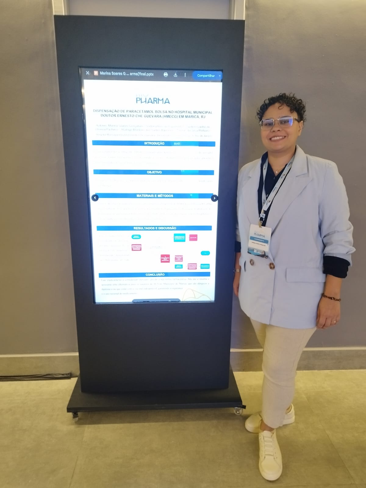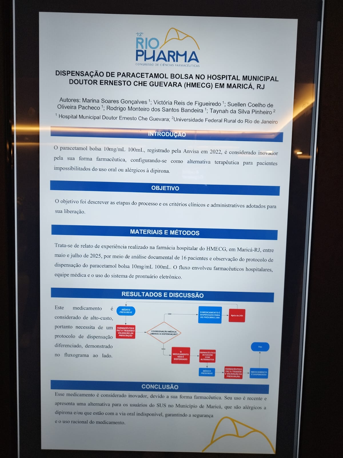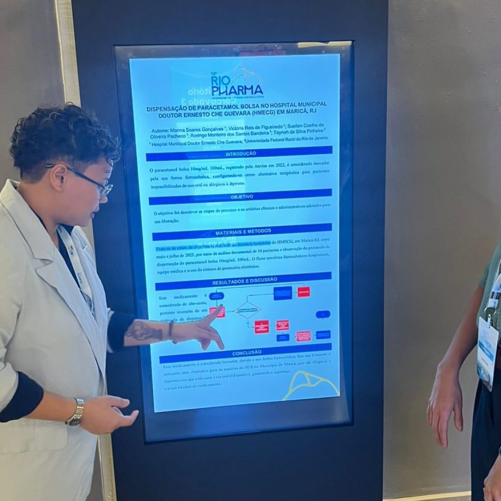 A Prefeitura de Maricá, por meio da Secretaria de Saúde, marcou presença no 12º Congresso RioPharma de Ciências Farmacêuticas com um estudo desenvolvido por profissionais do Hospital Municipal Dr. Ernesto Che Guevara. O pôster científico foi apresentado no mês de setembro e abordou a dispensação do medicamento ‘Paracetamol bolsa’, destacando a experiência da unidade hospitalar na implementação e manejo do recurso.