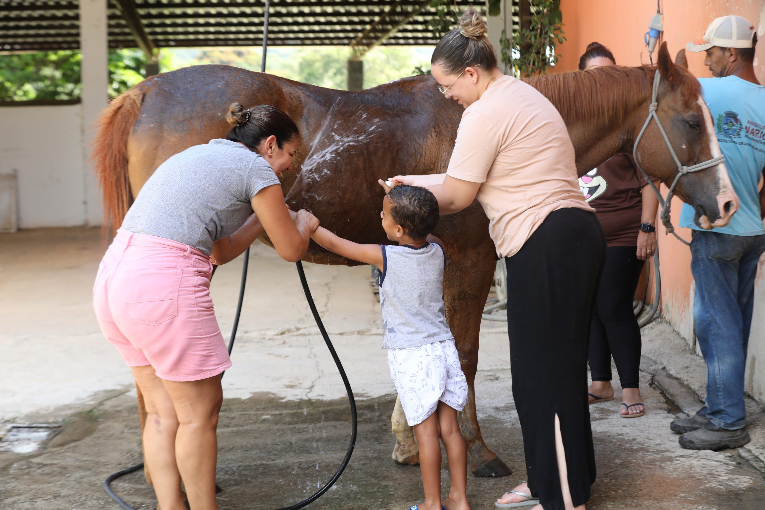 A Prefeitura de Maricá, por meio da Secretaria da Pessoa com Deficiência e Inclusão, promoveu nesta terça-feira (13/01) o segundo dia da 2ª Semana de Atividades Diferenciadas da Equoterapia. A iniciativa oferece cuidado, inclusão e desenvolvimento às pessoas com deficiência. A atividade do dia foi o “Banho no Cavalo”, uma vivência lúdica e terapêutica que estimula coordenação motora, percepção sensorial, vínculo afetivo e autonomia das crianças atendidas pelo programa de equoterapia.