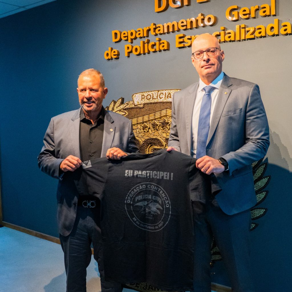 Deputado Guilherme Delaroli (E) esteve com o secretário de Polícia Civil, Felipe Curi, na manhã desta terça-feira (3), na Cidade da PolíciaCristiano Masruha/Divulgação