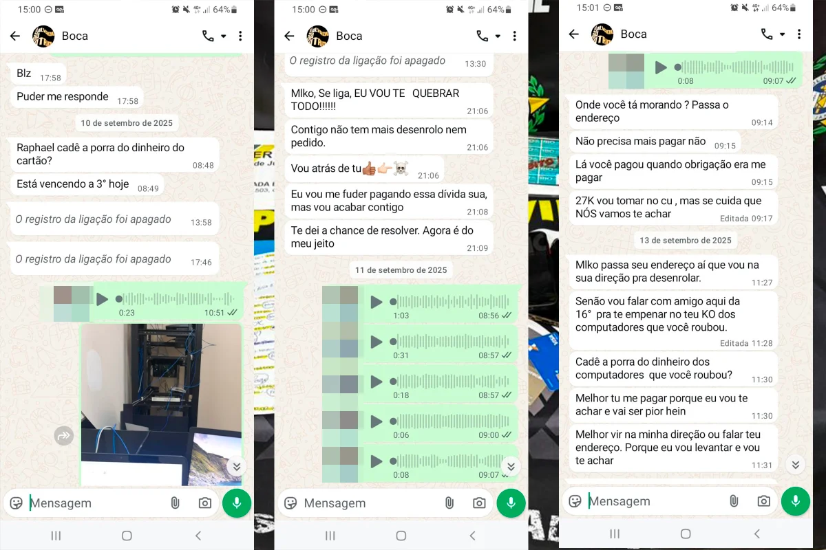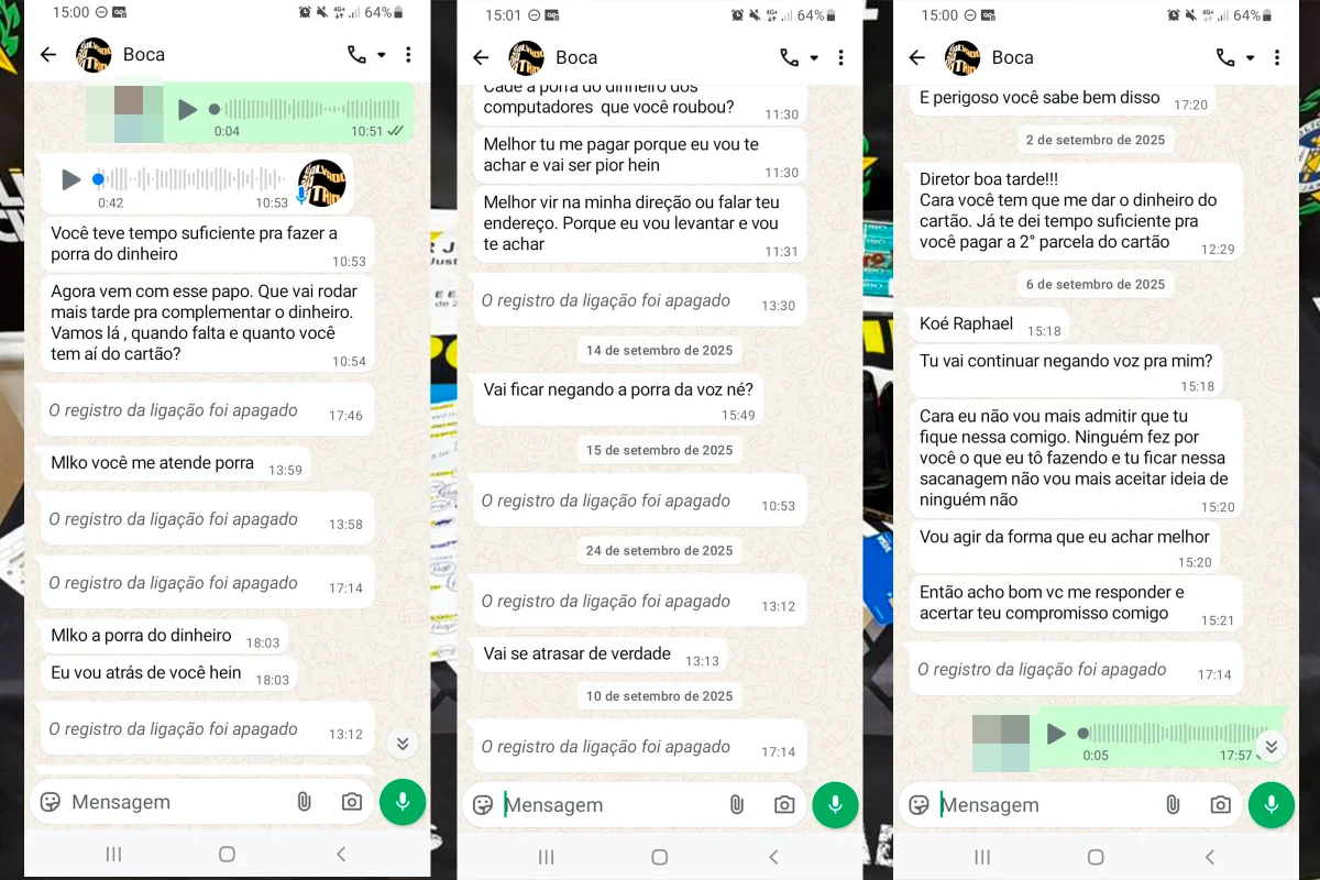 Os pagamentos eram exigidos em dinheiro vivo ou por meio de máquinas de cartão que o próprio agiota fornecia. Em mensagens enviadas às vítimas, “Boca” fazia ameaças diretas de morte caso os valores não fossem pagos imediatamente.