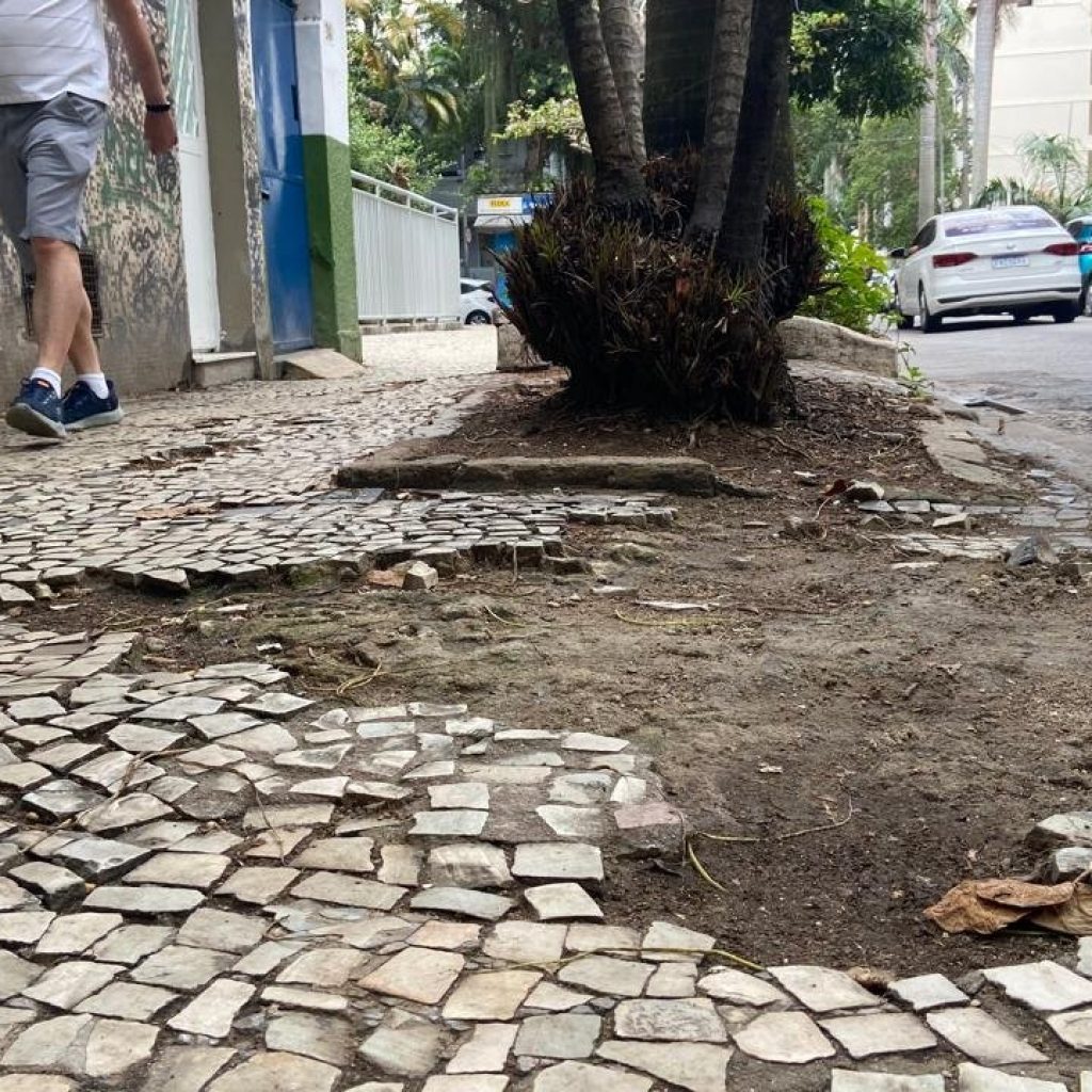 Raízes de árvores centenárias avançam sobre calçadas de pedras portuguesas, esburacadas em diversos trechos. A Comlurb tem optado por cortar exemplares comprometidos, mas sem replantio, a paisagem histórica se desfaz aos poucos. O asfalto na pista também exibe buracos.