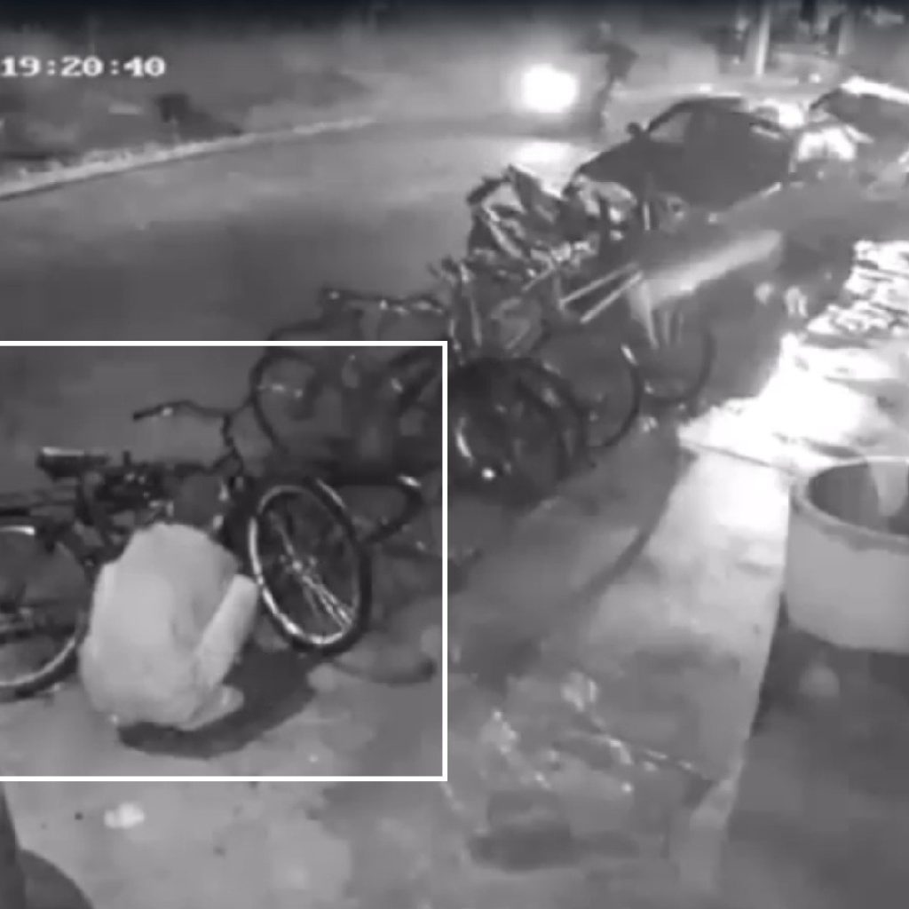 Imagens de câmeras de segurança mostram um homem se aproximando da bicicleta e passando a mexer nos cadeados.