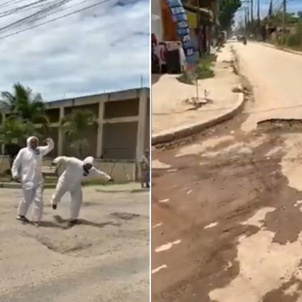 Moradores fazem protesto com fantasias ‘da Nasa’ contra buracos em ruas de Cabo Frio