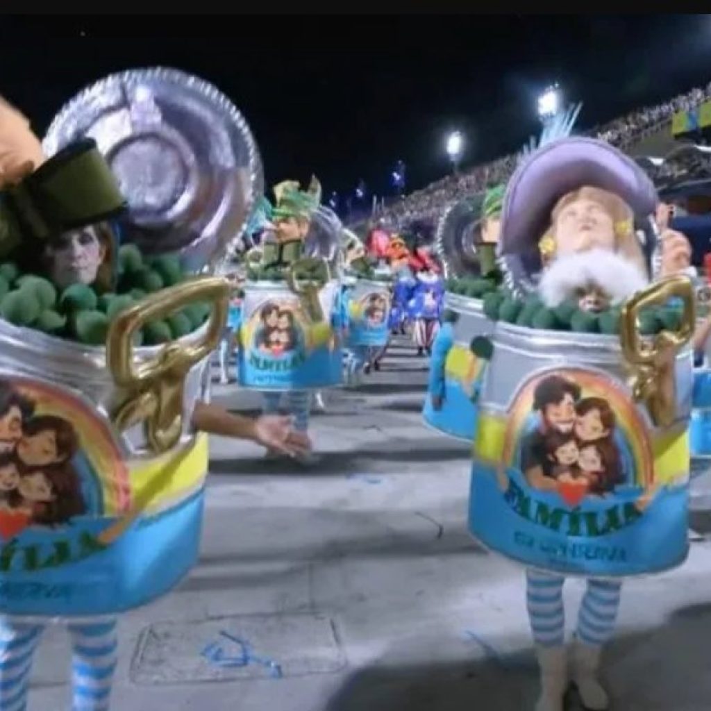 Na ala em questão, integrantes atravessaram a Sapucaí vestidos como latas de alimentos, com rótulos estampando a expressão “família tradicional” e imagens de pai, mãe e filhos. Máscaras representando pastores evangélicos e fazendeiros reforçaram o ataque da escola a setores conservadores que, segundo a justificativa oficial, atuam em oposição ao presidente Luiz Inácio Lula da Silva (PT).