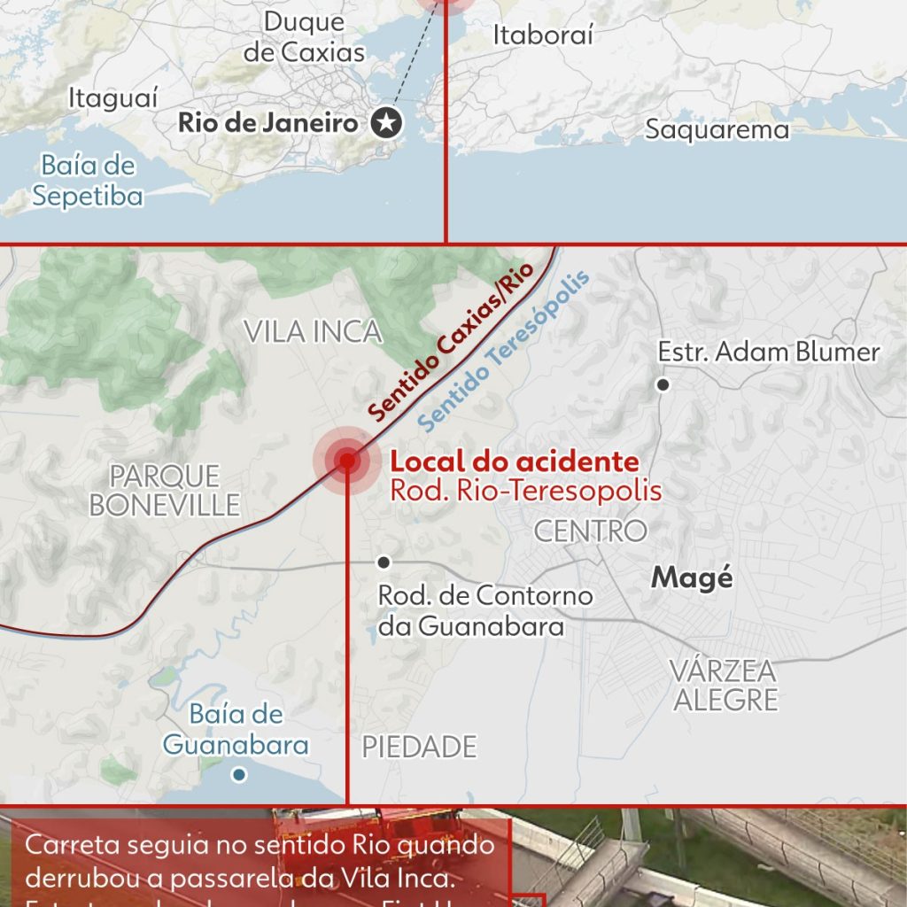 Caminhão derruba passarela, e motorista de carro morre esmagado na BR-116, em Magé