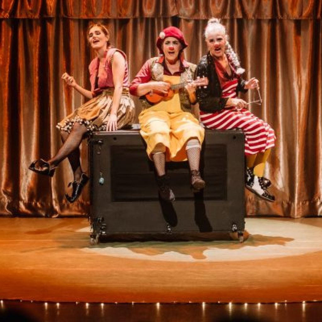 A encenação também aposta em elementos do teatro de animação, incorporando as “bonecas-palhaças”, manipuladas pelas próprias atrizes, que ampliam o jogo cênico e trazem novas camadas de comicidade e poesia. Outro destaque é a “caixa-carroça”, um elemento cênico multifuncional que se transforma conforme o jogo teatral exige — de mesa a caixinha de música —, simbolizando a eterna reinvenção da arte circense diante dos tempos.