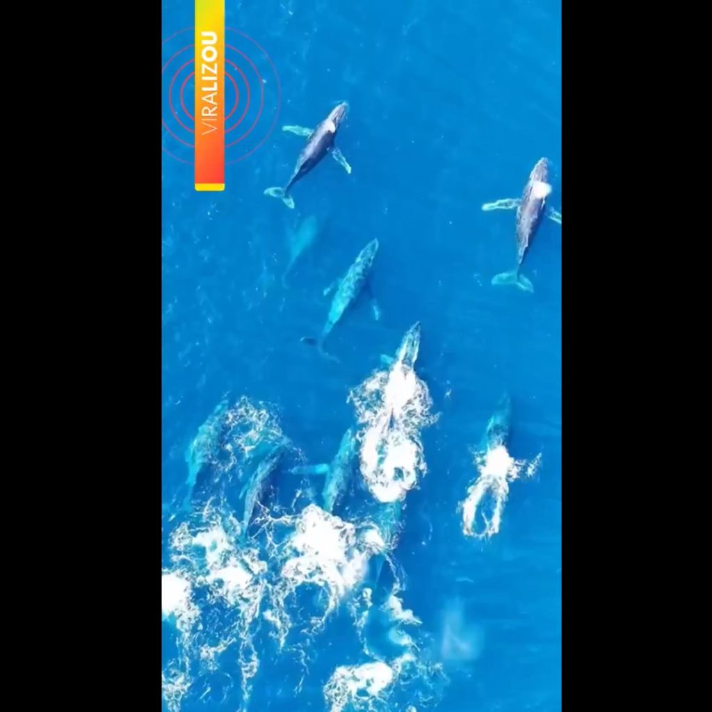 “Na verdade, eu não esperava que houvesse dez jubartes. Eu vi de longe o movimento na água e subi o drone. Elas estavam a 7 km de distância. Fiquei cinco minutos filmando e voltei por conta da bateria do drone”, contou.
