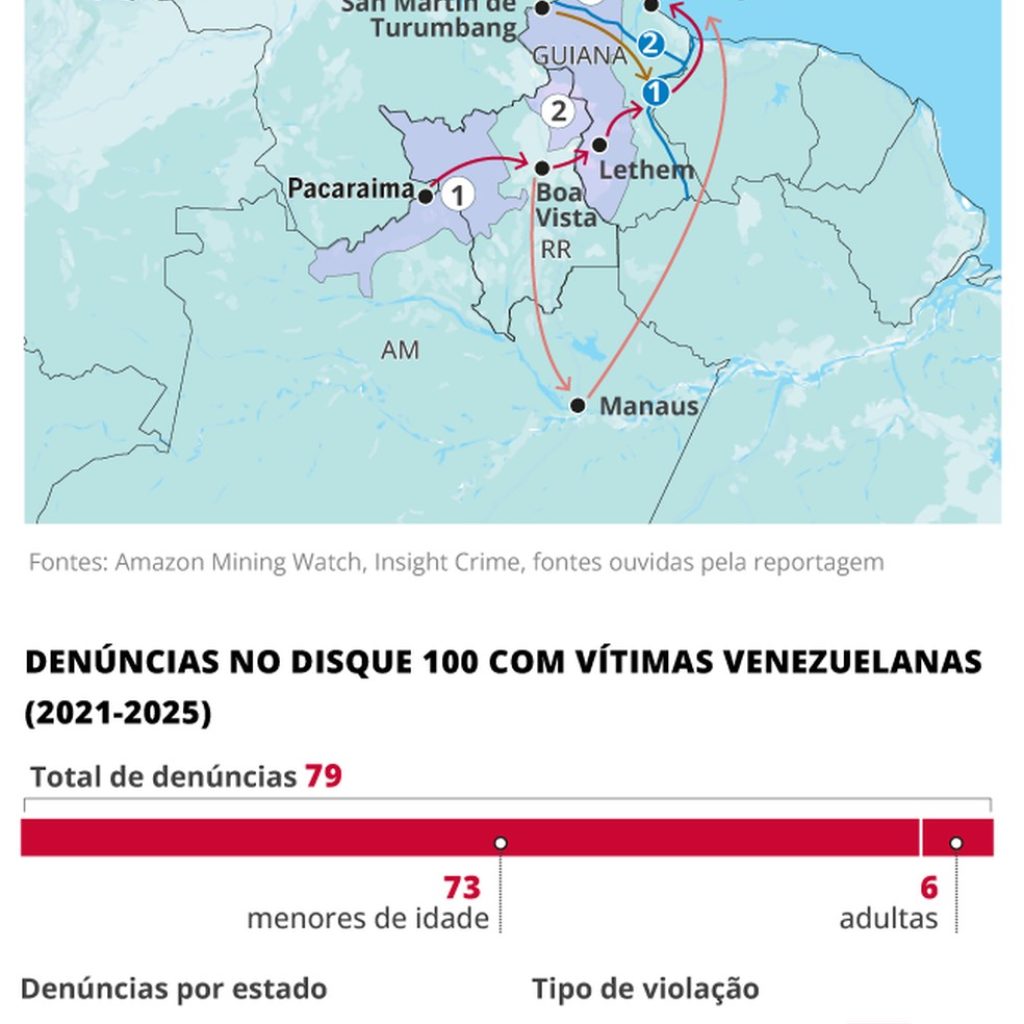 Das 857 denúncias de tráfico humano recebidas pelo Disque 100 (canal do governo para violações de direitos humanos) entre 2017 e 2023, apenas uma tinha como vítima uma pessoa venezuelana, de gênero não identificado, apontam dados obtidos via LAI. Desse montante, somente nove denúncias foram feitas em Roraima. Oliveira, no entanto, afirma que o novo levantamento da UFRR sobre vítimas de tráfico de pessoas no estado entre 2024 e 2026, a ser concluída no segundo semestre, já aponta um patamar de 300 vítimas – similar ao biênio anterior.