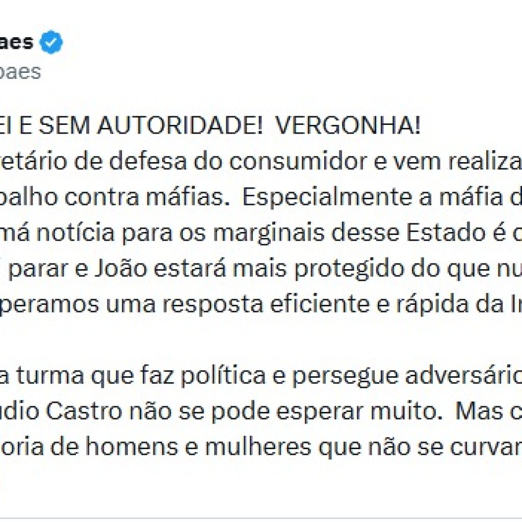 “João é meu secretário de Defesa do Consumidor e vem realizando um excepcional trabalho contra máfias. Especialmente a máfia dos Postos de Gasolina. A má notícia para os marginais desse Estado é que esse trabalho não vai parar e João estará mais protegido do que nunca. Obviamente, esperamos uma resposta eficiente e rápida da Instituição Polícia Civil.”, publicou Paes.