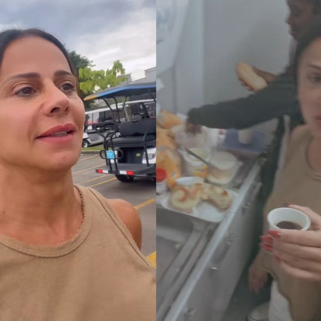Depois, ela foi filmada pelo maquiador Maxwell Pinheiro tomando um café da manhã superreforçado com suco, bolo e pães. “Hoje não é o desfile, pode a rainha de bateria ter esse café da manhã?”, brincou o rapaz.