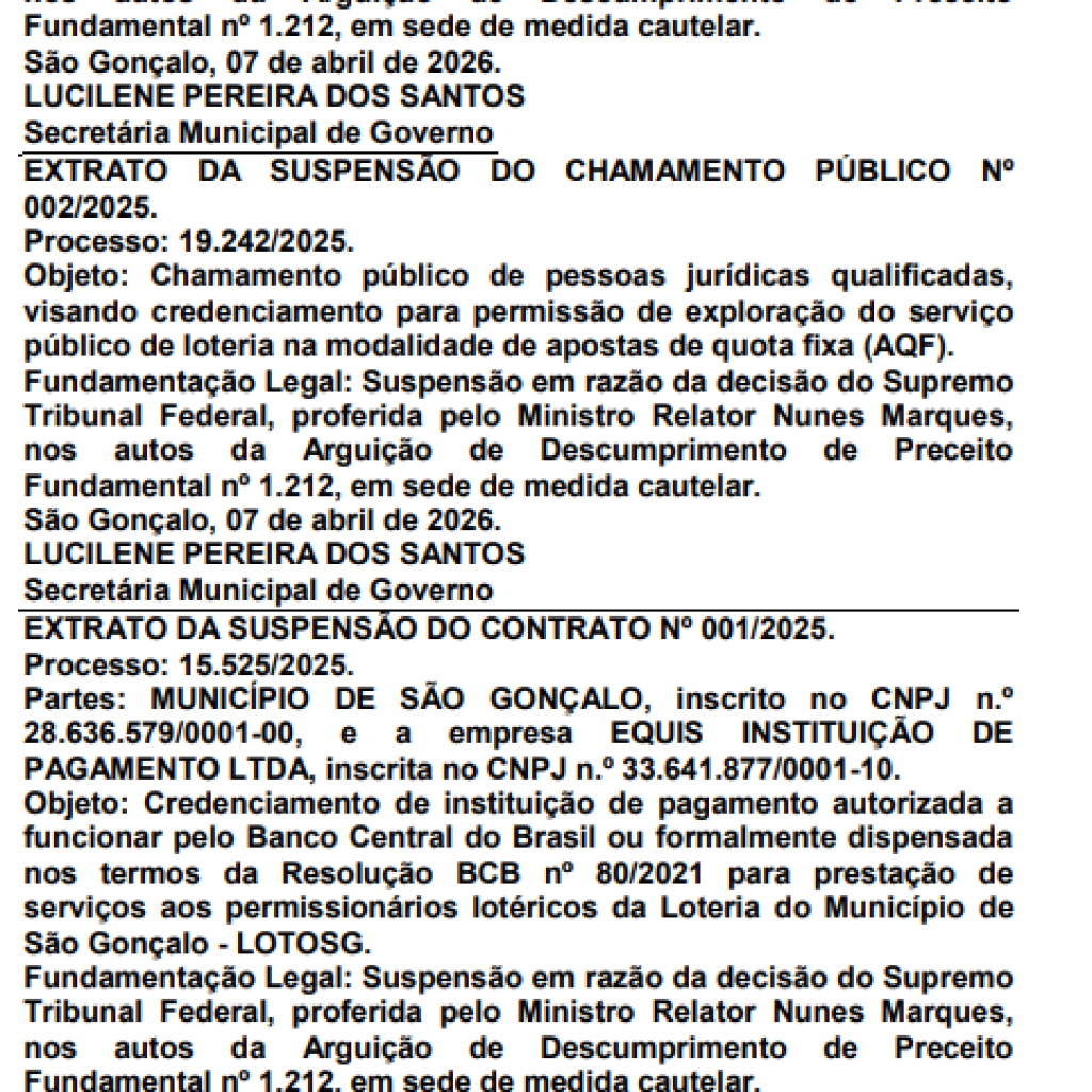 Em São Gonçalo, a tesoura passou por tudo. Foi suspenso o credenciamento lançado em 16 de maio de 2025, que escolheria as instituições responsáveis pela gestão dos pagamentos das apostas. Também caiu o contrato com a empresa Equis Pay, assinado em 24 de setembro do mesmo ano, que cuidaria da área financeira da loteria municipal.